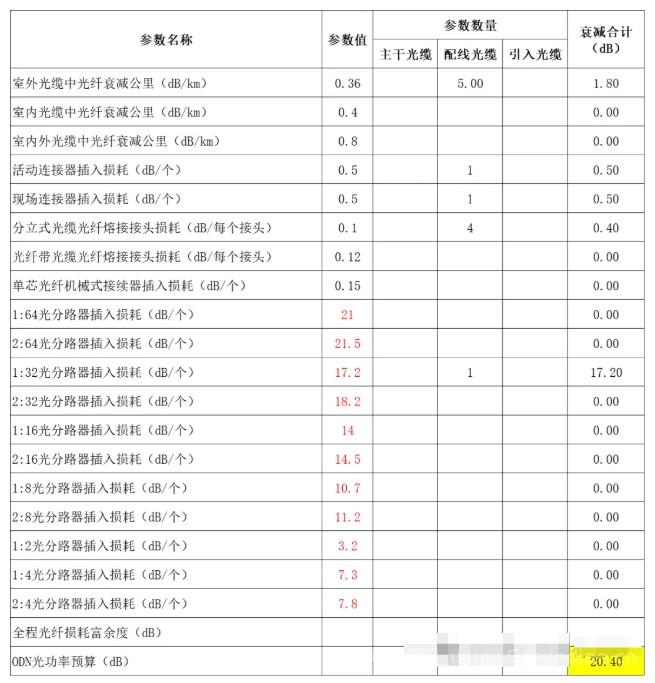其实光纤损耗的计算也是非常简单,就是将所有的连接点、光分器、光纤本身的损耗加起来,小于26db就满足要求,先来看表格。