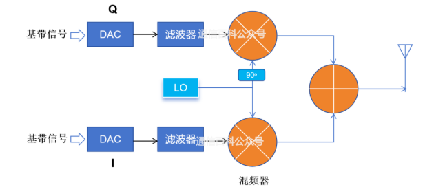 其中 I(同相)和 Q(正交)两条路径分别有自己的混频器和滤波器来处理信号。I 信号和 Q 信号通过同一个本地振荡器(LO) 混合,不过这个本振在其中一条 LO 路径上设置了一个 90° 的移相器 。这个90度的相移确保了 I 信号和 Q 信号彼此正交且互不干扰。