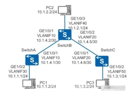 配置主机PC1的缺省网关为10.1.1.1,主机PC2的缺省网关为10.1.2.1,主机PC3的缺省网关为10.1.3.1。