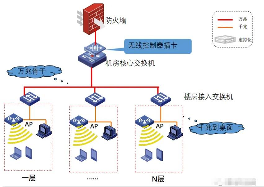 1、中心AP通过网线延伸到房间,连接内外网的模块分别部署不同房间,一个模块可以覆盖2个房间空间。