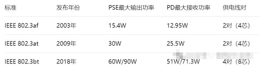 一个主要的变化就是功率在增加,最开始的IEEE 802.3af标准只支持15.4w,到现在bt标准支持90w,支持供电的设备范围越来越广了。