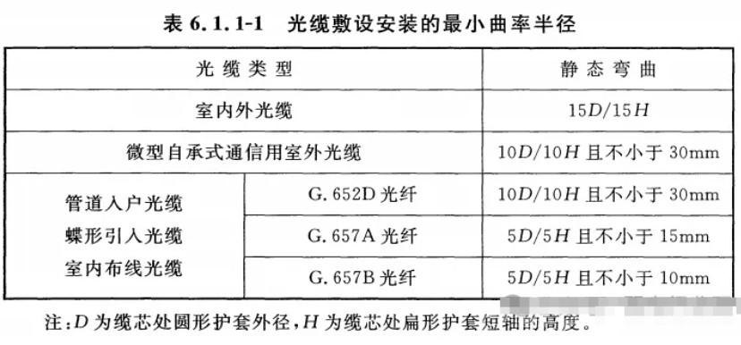 实际施工时,还是需要注意下,尽量不要弯曲的太狠,上面给出的是最小半径,施工操作时不要小于表格规范给出的半径,否则光缆衰减值会过大。