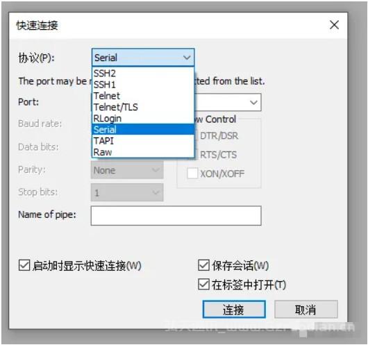 新建连接后,弹出界面,选择“Serial”,为什么是serial口,serial口是串口,与交换机的连接方式一致。