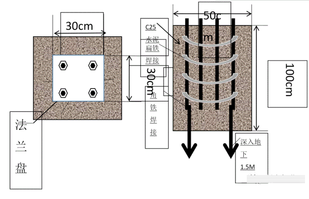 采用混凝土加钢筋笼浇注,4米以下预埋件尺寸不小于0.3m*0.3m*0.6m,灌浇水泥尺寸不小于0.5m×0.5m×0.6m。